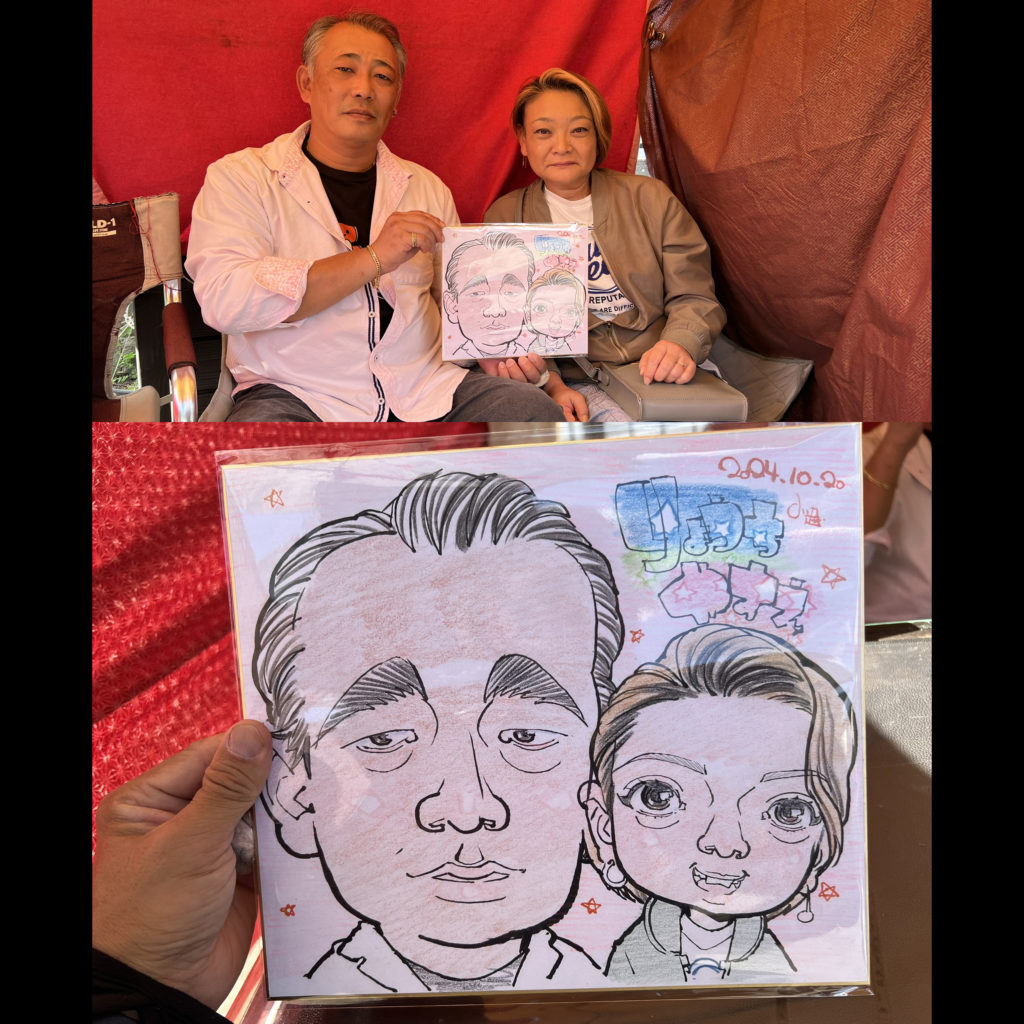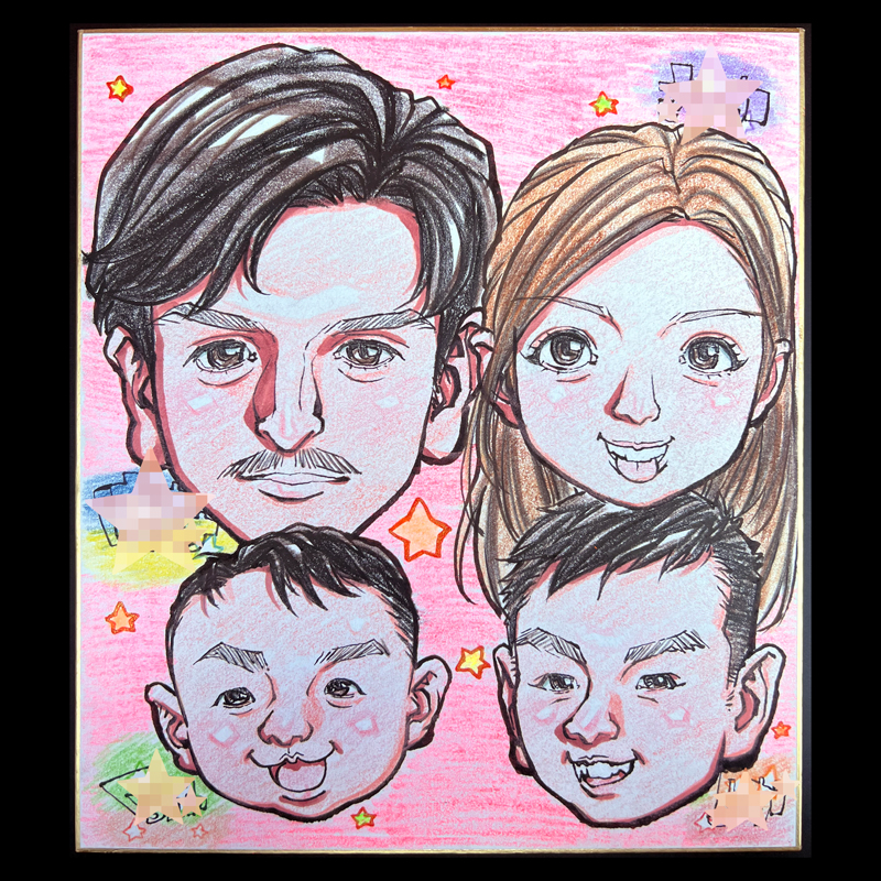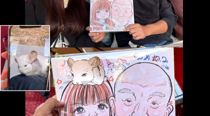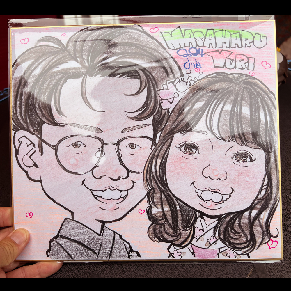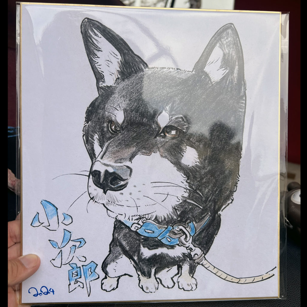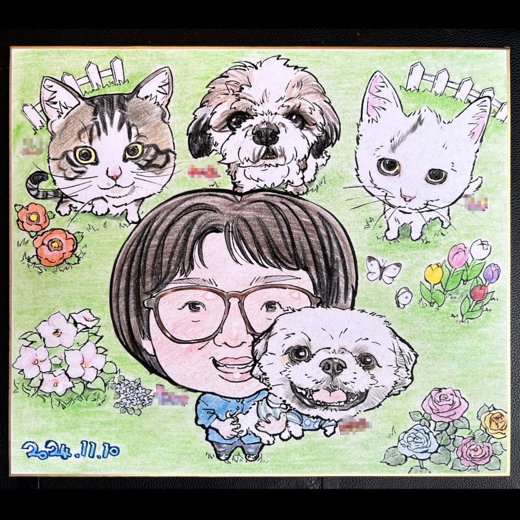 現場でお描きしたお客様から、後日プレゼント用にご注文いただいた絵です。1.5頭身でワンちゃんを抱っこすると手が届かないうえ、頭がごっちんするため何とかごまかして調整しました。