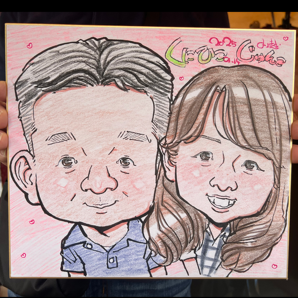 ご夫婦で同年代のお二人をおかきしたのですが、 今見ると奥様の口の横にほっぺの線を入れても良かったかもしれません^^