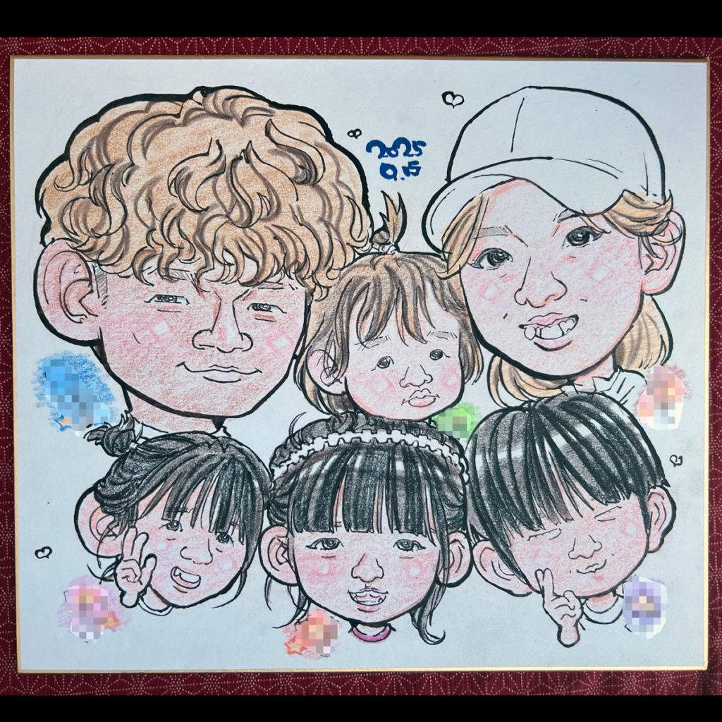 ご家族初似顔絵です!人数が多いのでお写真から!一度お描きしてもう一枚よりポップなタッチで描き直しました。