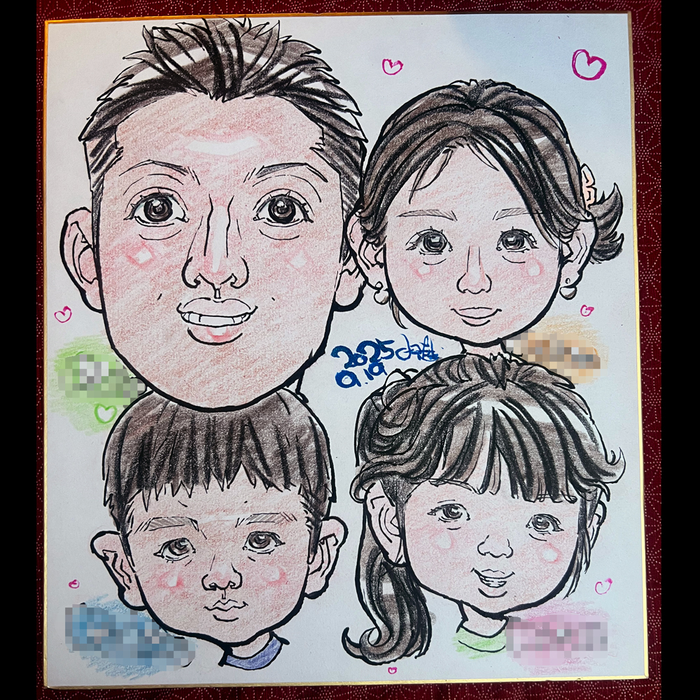 初家族似顔絵ということで、ノーマル可愛いタッチで左上のご主人から描き進めていく内に、絵柄が昭和イラストタッチになっていきました^^
