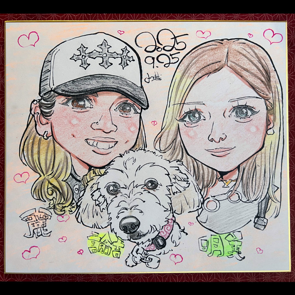 キラキラ系のお姉さんと触ってもらうのが好きな犬、諭吉君と共に。お買い物をされている間にお写真から作画!!