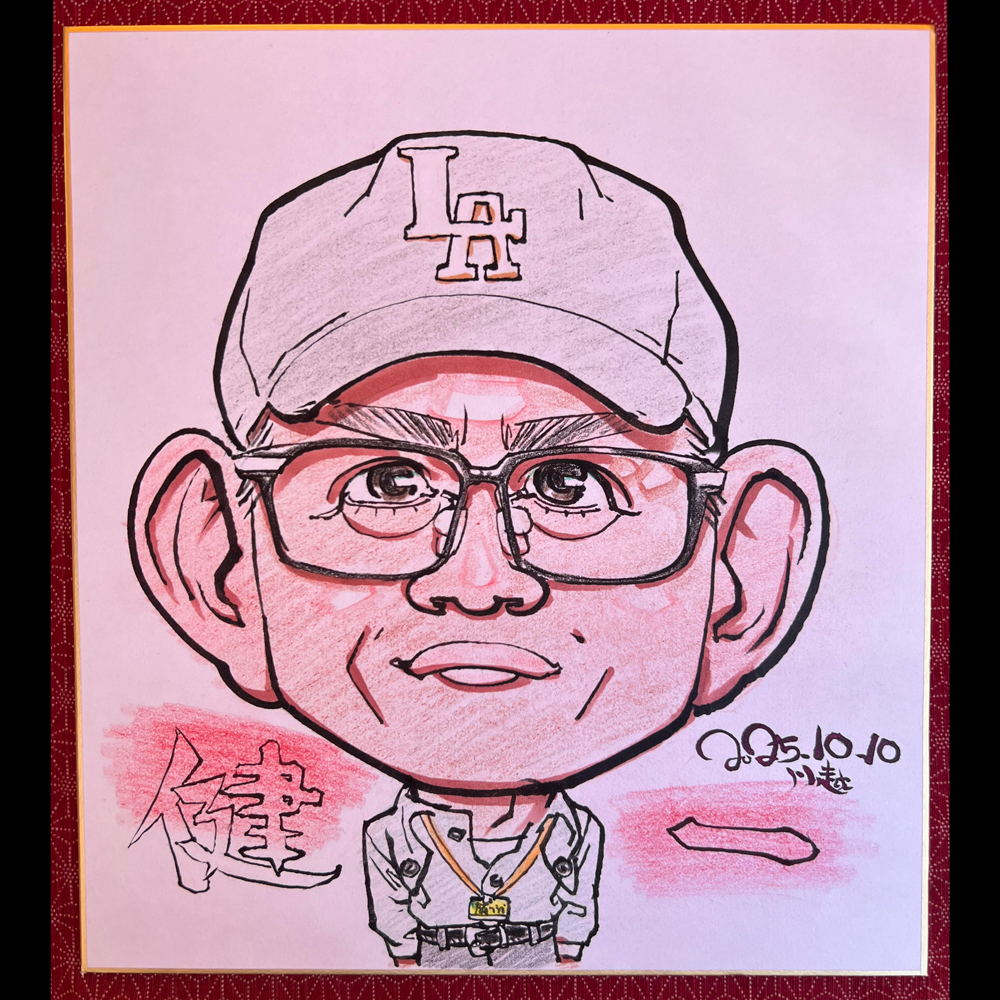 小学生の校外学習引率の合間で来られた旅行会社の男性です。お写真から描いている間ずっと、大ファンだというドジャースの試合状況を球場の図形と得点データのみサイトでチェックされていて、ドジャースが勝ったと喜んでらっしゃいましたが、試合動画を一切チェックされないのが不思議でした。