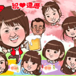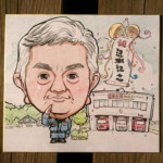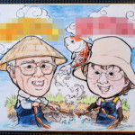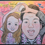 Presentこちらはプレゼント用似顔絵。古希祝いを6人のお孫さんと共に!若々しくテニスルックで。中学ブラスバンド部時代の恩師が有名な指揮者になり、かつての教え子達からの寄せ書きプレゼントです。一番大きな色紙、F10サイズ(455×530)の大判にお描きしました。ご両親へのプレゼント絵で、大切に育てている鯉を入れて欲しいとのご依頼。お二人共に明るい表情をしているので楽しい雰囲気が出ました。水しぶきの形をちょっと和風にして、滝登りのような雰囲気を出しました。何度か川越にお立ち寄りの際、ご注文頂いているお客様からの誕生日プレゼント絵です。お二人の腕がハートマークになるようにとのご注文でしたが、手の部分をもっとハートにすべきだったと反省しきりです。その分ハートを沢山描きました♡♥♡
